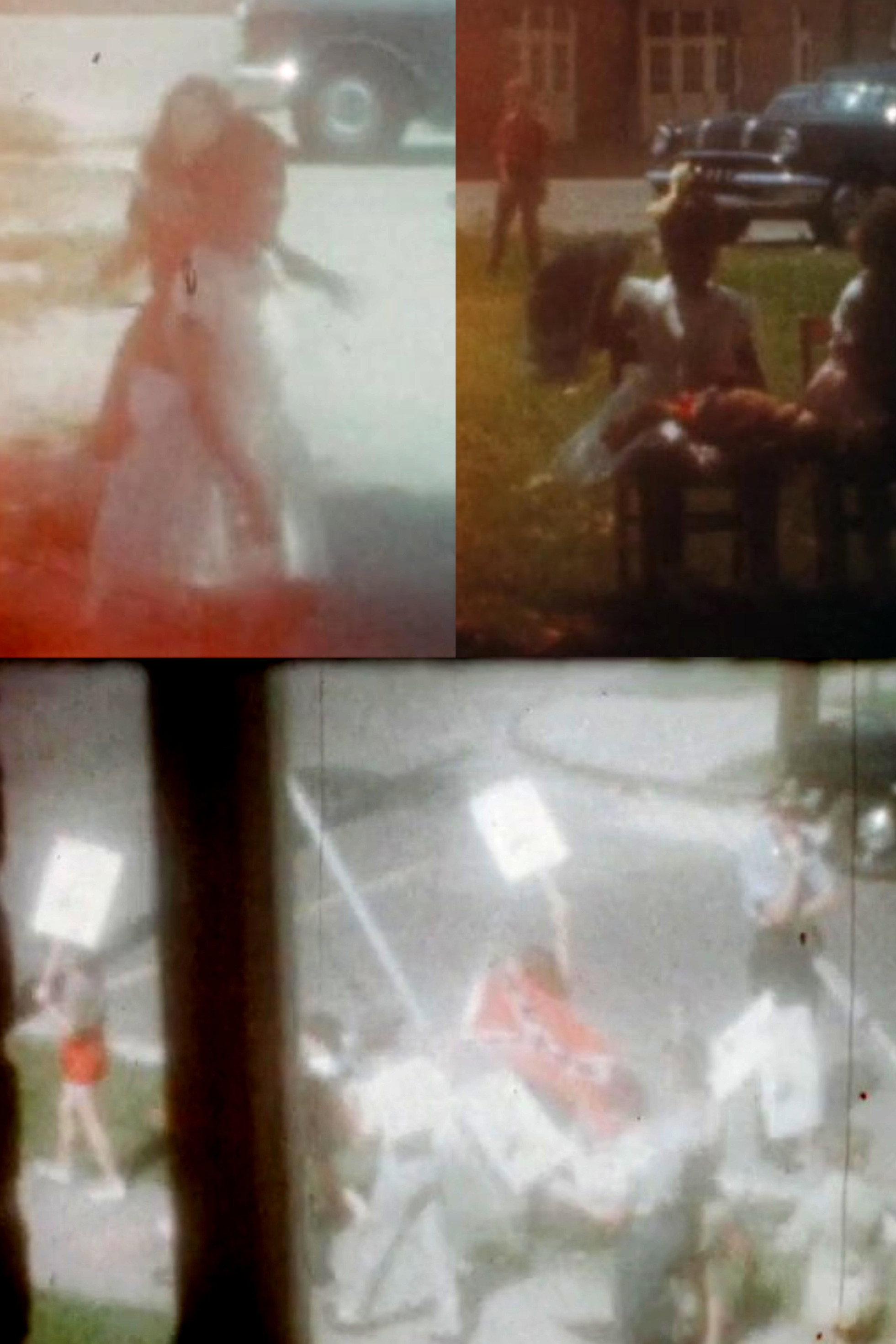 8mm home movie showing picketers and Ruby Bridges at her elementary school, likely Spring 1961.