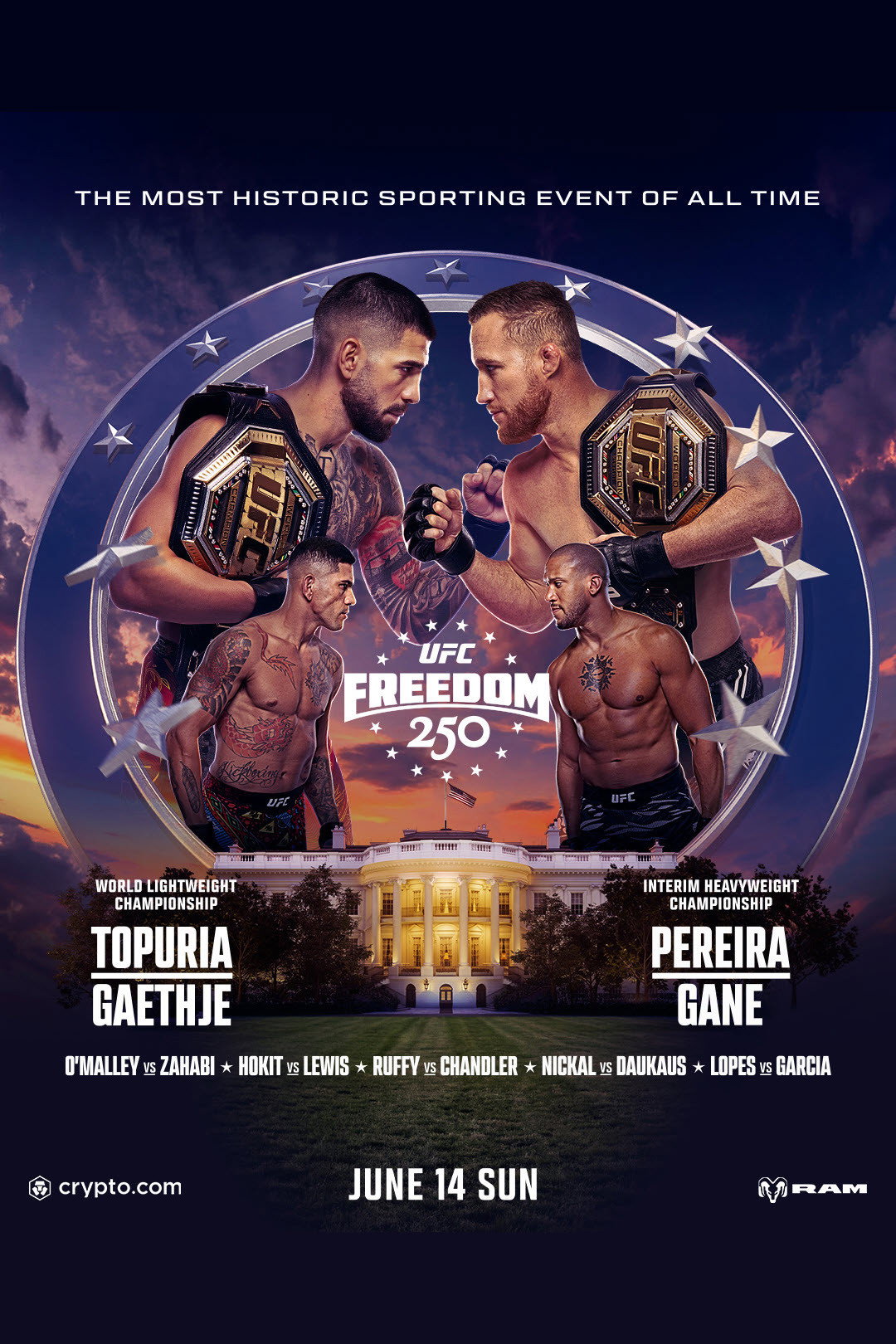 UFC Freedom 250: Topuria vs. Gaethje (also known as UFC White House) was a mixed martial arts event produced by the Ultimate Fighting Championship that took place on June 14, 2026, on the South Lawn of the White House in Washington, D.C., United States. The event's name is a reference to the America 250th anniversary in the United States.
