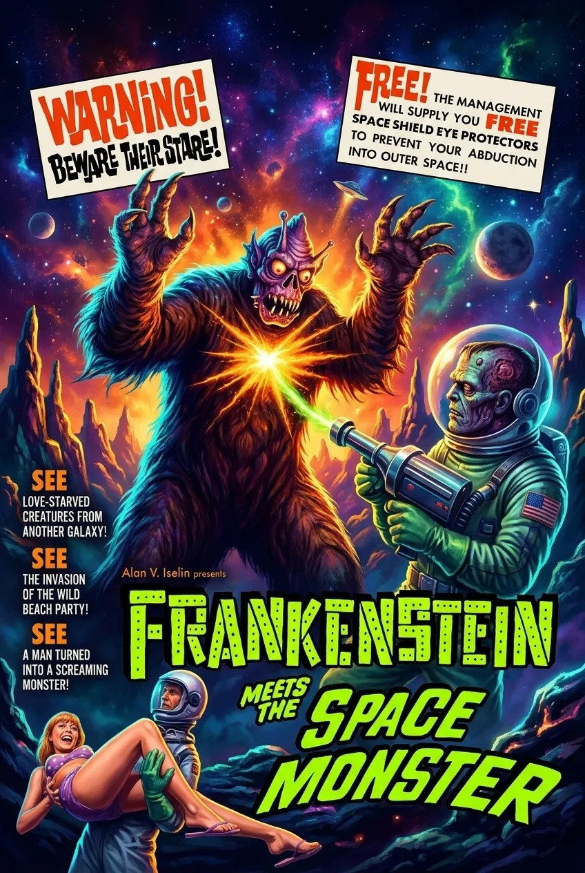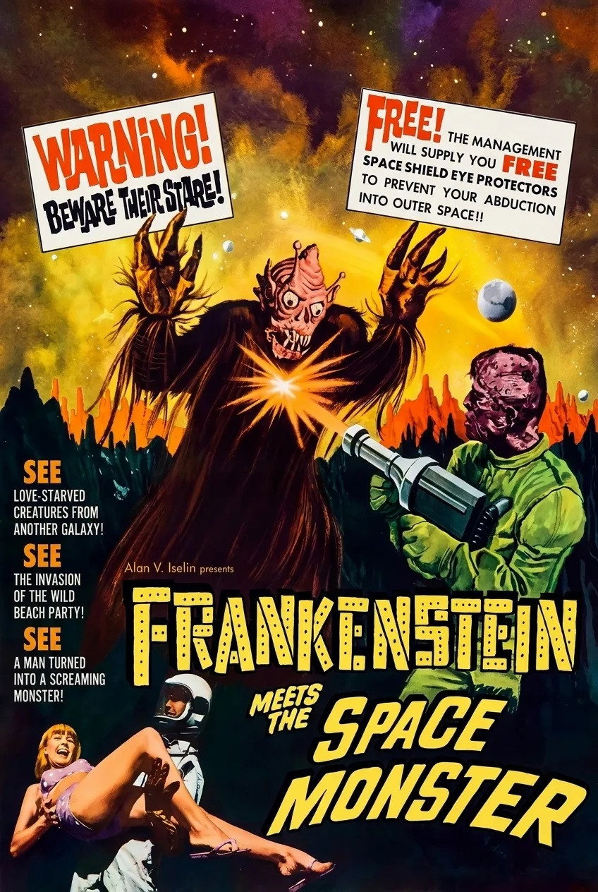 Loopy go-go horror sci-fi, made in Puerto Rico. Space Princess with a drooling bald sidekick travels to Earth to recruit bikini girls for her planet. Meanwhile, Army scientist Karen has created an astronaut-android hybrid. He is disfigured in a crash and goes on a rampage. It all makes sense to them.