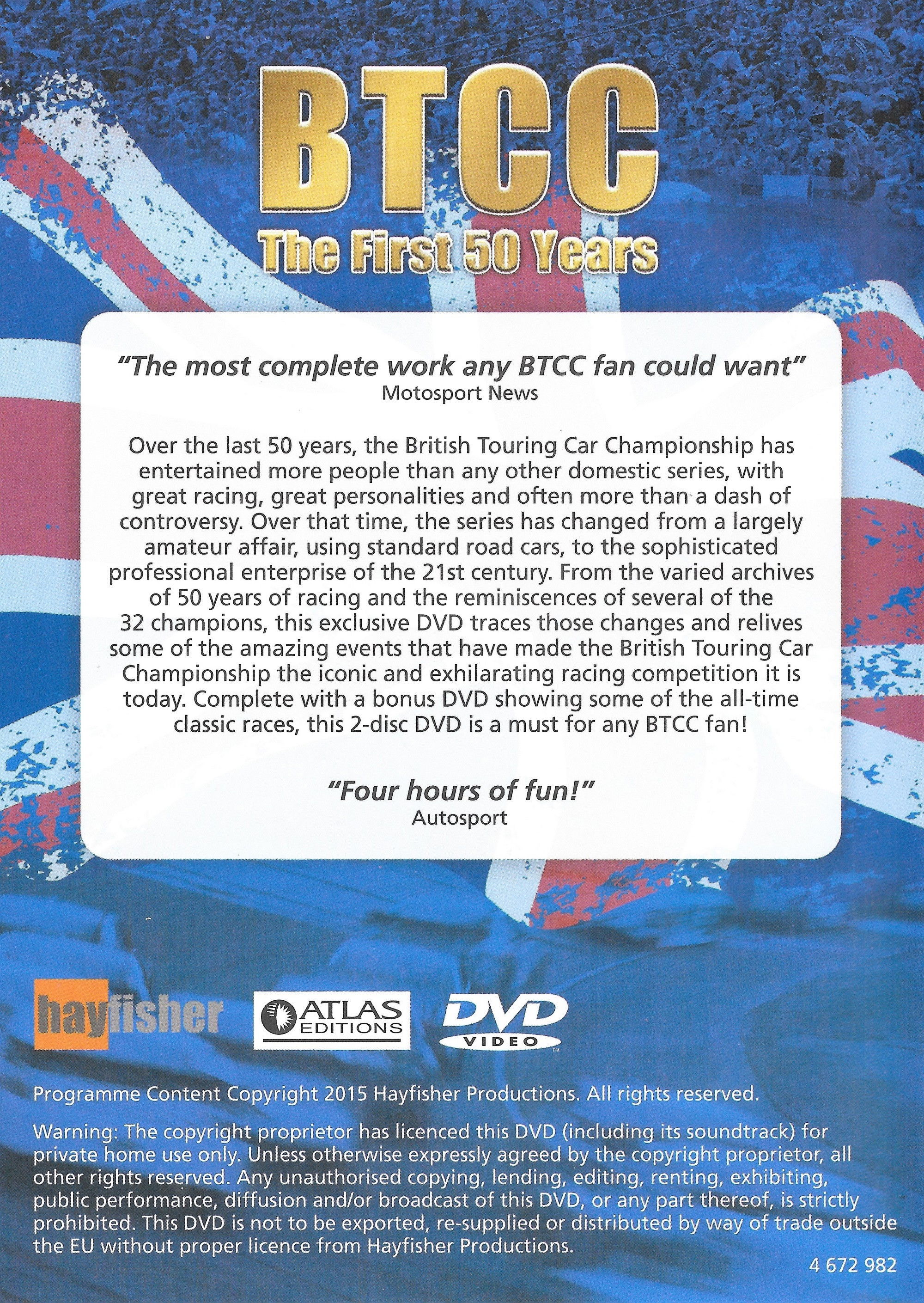 "The most complete work any BTCC fan could want" Motorsport News.... Over the last 50 years, the British Touring Car Championship has entertained more people than any other domestic series, with great racing, great personalities and often more than a dash of controversy. Over that time, the series has changed from a largely amateur affair, using standard road cars, to the sophisticated professional enterprise of the 21st century. From the varied archives of 50 years of racing and the reminiscences of several of the 32 champions, this exclusive DVD traces those changes and relives some of the amazing events that have made the British Touring Car Championship the iconic and exhilarating racing competition it is today. Complete with a bonus DVD showing some of the all time classic races, this 2 disc DVD is a must for any BTCC fan!.... "Four hours of fun" Autosport
